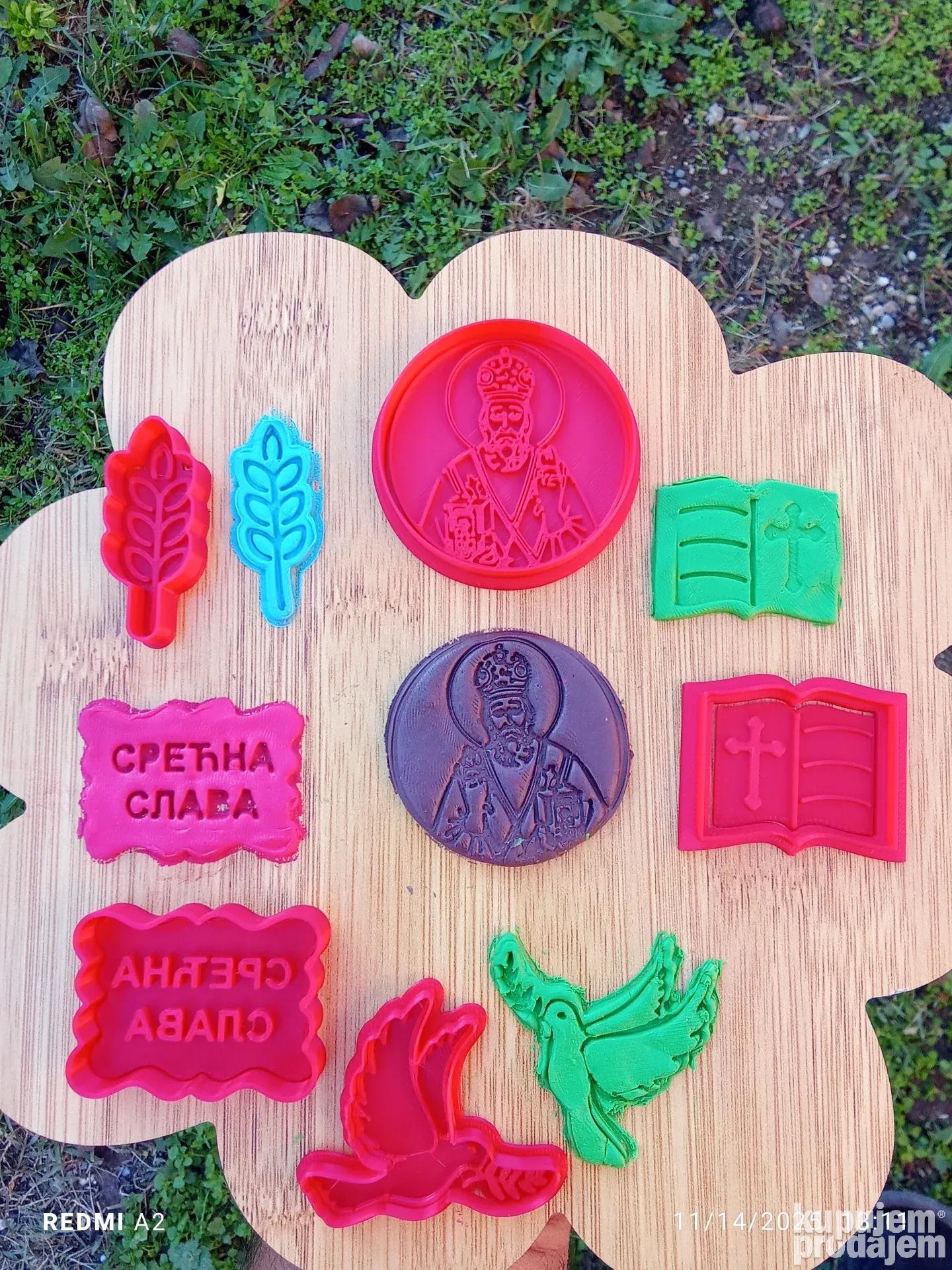 Set modli (sa utiskivačima) za ukrašavanje slavskog kolača Veličine: modla Sveti Nikola 8cm prečnik, modle za ukrase S veličina (oko 6cm)